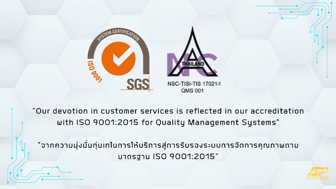 จากความมุ่งมั่นและทุ่มเทในการให้บริการของบริษัท นำไปสู่การได้รับการรับรองระบบการจัดการคุณภาพตามมาตรฐานสากล ISO 9001:2015 และ ISO 14001:2015